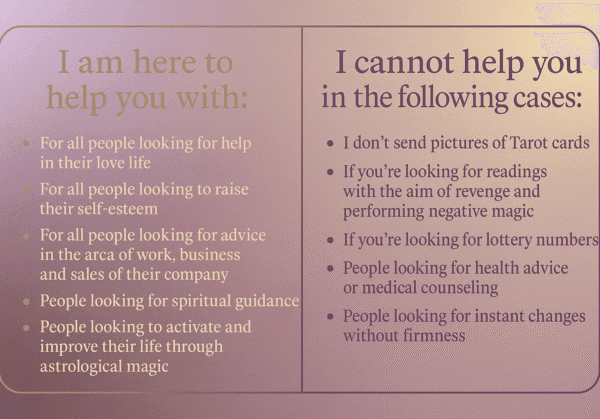 Discover the power of tarot readings and transform your life with clarity and purpose. Whether you're facing a crossroads, feeling stuck, or simply seeking guidance, a personalized tarot reading can reveal the insights you need to move forward with confidence.I offer professional tarot readings designed to illuminate your path, uncover hidden influences, and help you make empowered decisions. Every session is unique, intuitive, and tailored to your current needs — whether it’s love, career, personal growth, or spiritual development.🔮 What you can expect:Clear, honest guidanceA safe and supportive spaceDeeper understanding of your challenges and opportunitiesActionable insights for your journeyYour future starts now. Don’t let uncertainty hold you back. Take the first step toward clarity and alignment.👉 Book your tarot reading today and unlock the answers you've been seeking.
